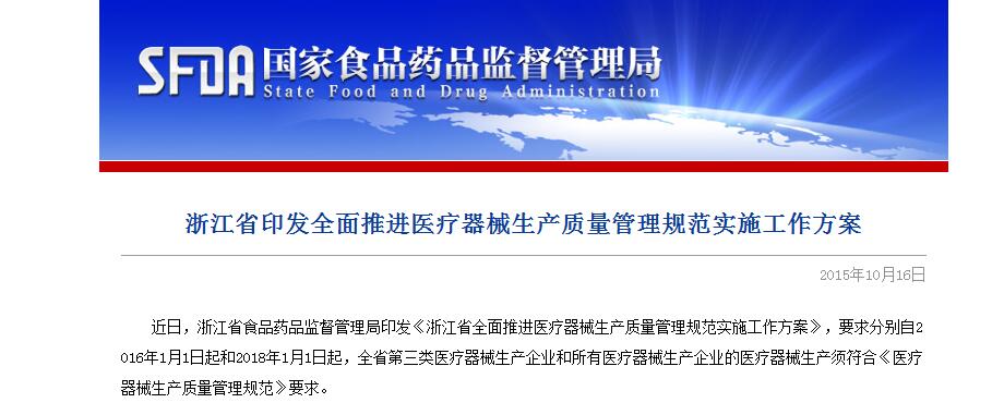 從國(guó)家食藥監(jiān)總局官網(wǎng)獲悉,近日,浙江省食品藥品監(jiān)督管理局印發(fā)《浙江省全面推進(jìn)醫(yī)療器械生產(chǎn)質(zhì)量管理規(guī)范實(shí)施工作方案》,要求分別自2016年1月1日起和2018年1月1日起,全省第三類醫(yī)療器械生產(chǎn)企業(yè)和所有醫(yī)療器械生產(chǎn)企業(yè)的醫(yī)療器械生產(chǎn)須符合《醫(yī)療器械生產(chǎn)質(zhì)量管理規(guī)范》要求。