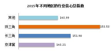 本次數(shù)據(jù)顯示:珠三角地區(qū)的行業(yè)信心總指數(shù)最高為158.58,其次為長三角、京津冀地區(qū)。